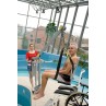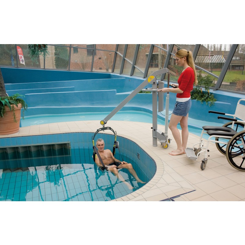 Sollevapersone mobile compatto per piscina, facilmente trasportabile tramite ruote.