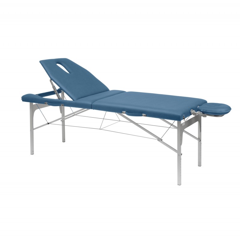 Lettino pieghevole a valigia, struttura in alluminio a due sezioni e regolabile in altezza.
