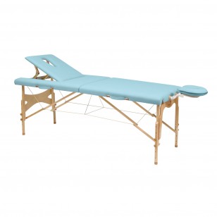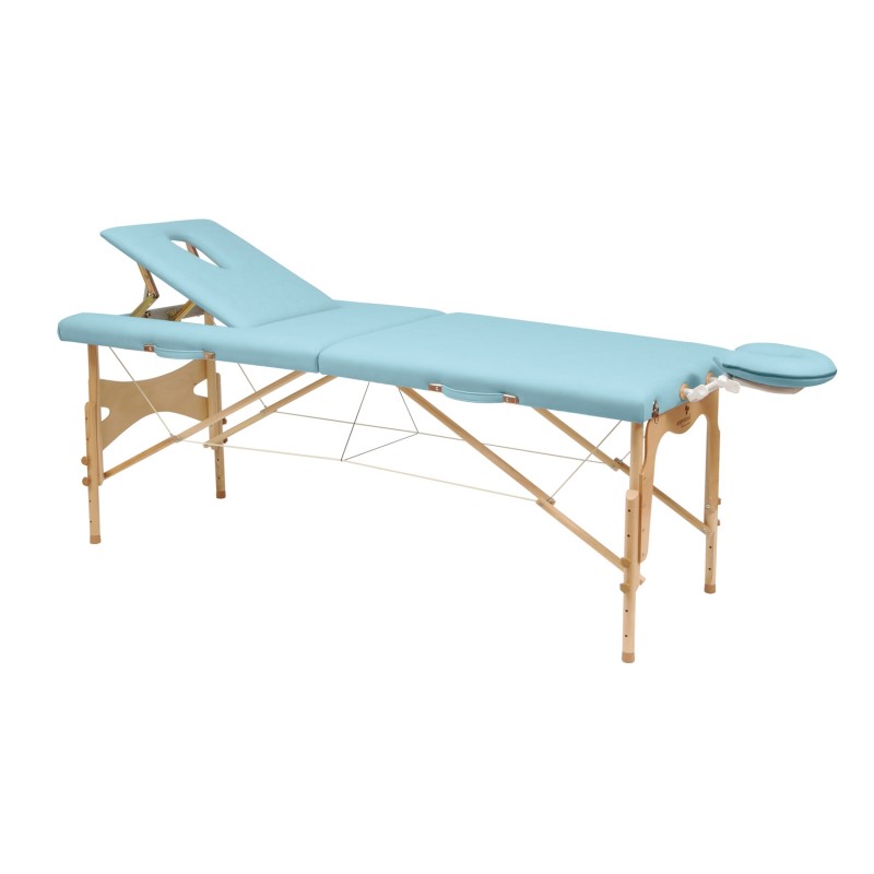 Lettino pieghevole a valigia, struttura in legno a due sezioni, regolabile in altezza.