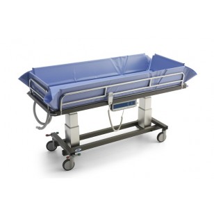 Barella per doccia e trasferimento per uso bariatrico utilizzabile sia in struttura assistenziale che a domicilio. Modello configurabile a seconda delle preferenze dell'operatore o dei familiari e delle caratteristiche antropometriche dell'utente. Dispone della possibilità di assumere la posizione di Trendelenburg, oltre all'inclinazine del piano di appoggio per il drenaggio dell'acqua. Dotata di paracolpi girevoli incorporati nella struttura del piano di appoggio.