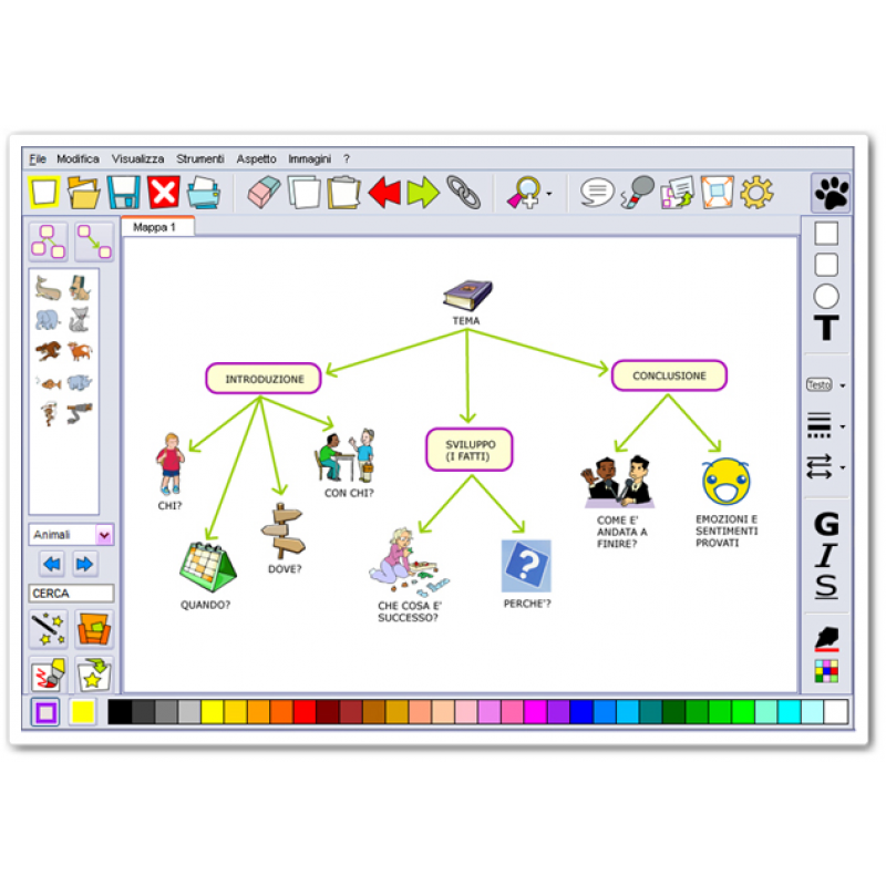 SuperMappe è il software per costruire Mappe Multimediali, cioè mappe concettuali, mappe mentali o schemi che contengono elementi multimediali che arricchiscono le opportunità di apprendimento e di compensazione della Dislessia.